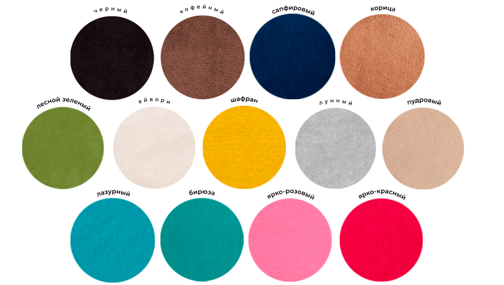 В линейку Fabric входит 13 цветов: черный, шоколад, серый, белый, темно синий, бордо, салатовый, изумруд, зеленое яблоко, фиолетовый, небесно голубой, розовый и желтый.